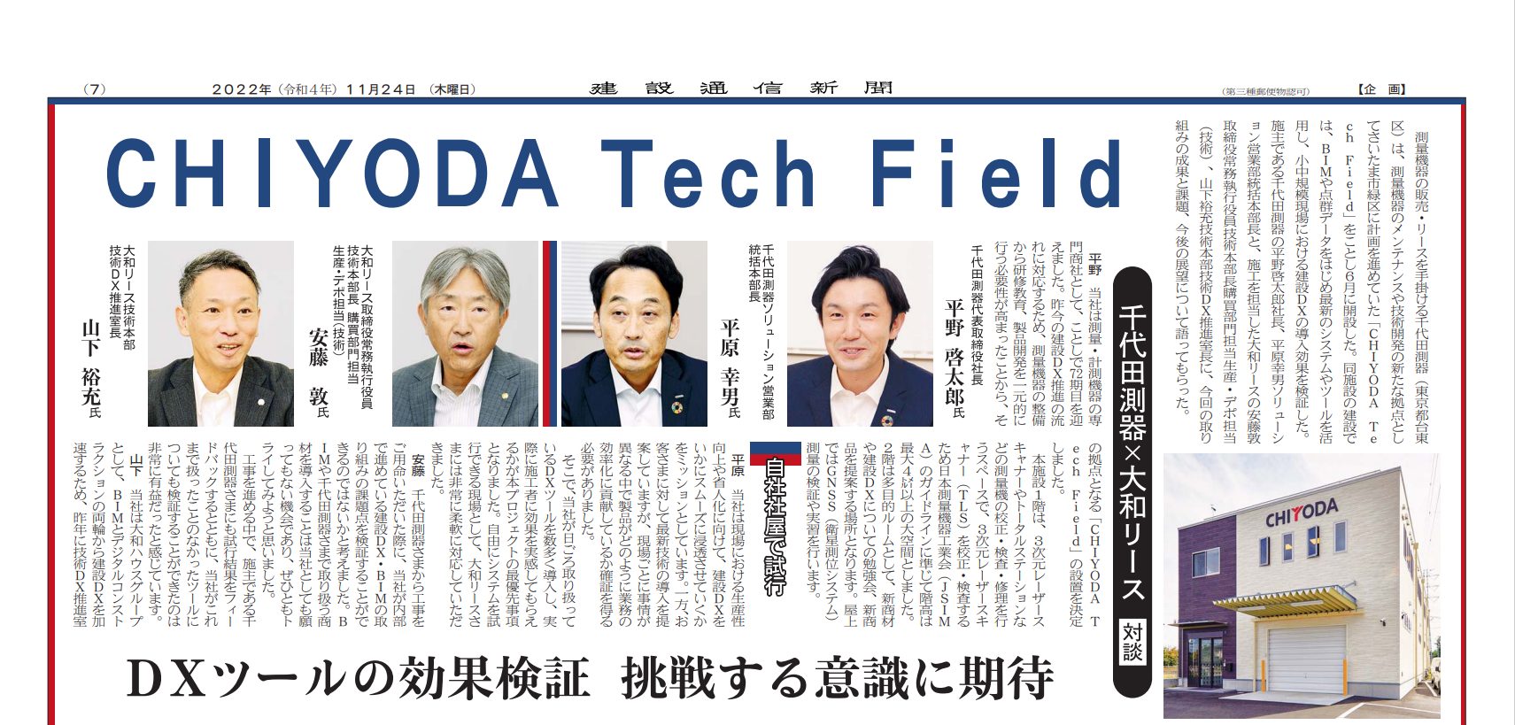 株式会社 日刊建設通信新聞社が発行している『建設通信新聞』に当社CHIYODA Tech Fieldにて行われた千代田測器×大和リースの対談が掲載されました。対談の様子につきましては、弊社SNSにも投稿しております。合わせてご覧ください。関連ソリューション:Trimble XR10、DXsite、KOLC+、SumiROBO、SiteVision 他