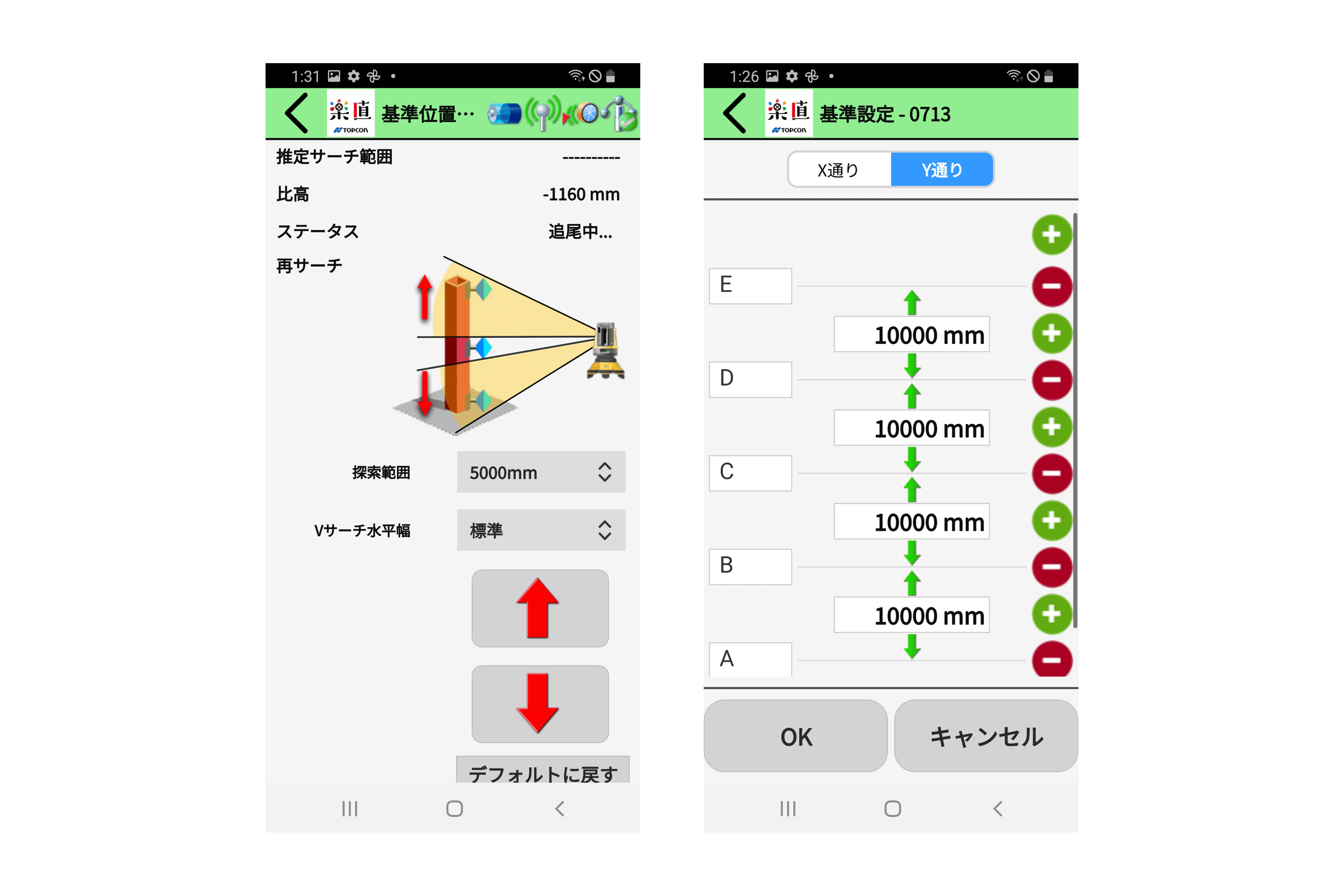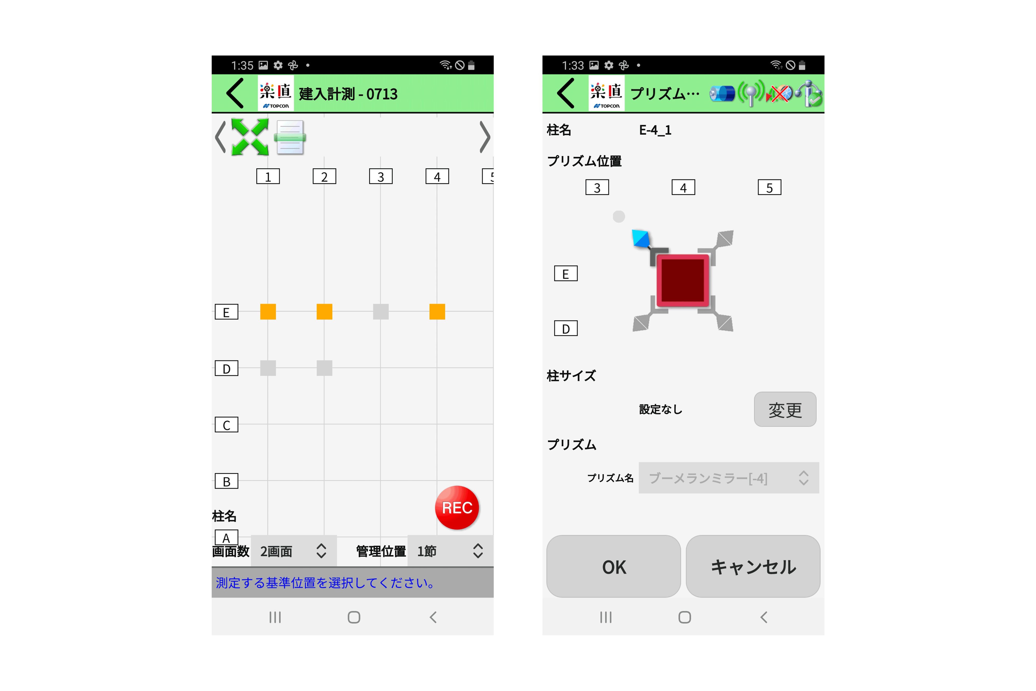 | 特徴 | スマホで建方! 「楽直」で鉄骨建入れ調整 「楽直」は鉄骨建方作業の際、スマホで計測器「楽位置」をコントロールし、柱の鉛直度を計測します。 1人で楽に建入調整をすることができ、作業終了後は出力ボタンにより記録・帳票データを自動作成します。 分かりやすい画面表示、誰でも使える簡単さ 設計データを用意する必要はなく、現場で入力を開始できます。 分かりやすい画面上で、通りの数、通り間の距離、プリズムを取り付ける位置などを設定できます。 最大柱4本分の両方向の倒れを1画面で表示 複数の鉄骨が計測できる場所に「楽位置」を設置、専用プリズムを複数の柱に取り付け、スマホアプリ「楽直」で計測します。 柱1本における前後左右の倒れを1回で計測、また1画面に最大4本分の柱の状態を表示でき、調整時間の大幅削減ができます。 帳票結果をボタン1つで自動作成しPDFで出力 デジタルで記録された計測結果データから、ボタン1つで帳票を自動作成でき、帳票はPDFファイルとして保存できます。 システム構成(別売り) 「楽直」は位置出し機「楽位置」と専用治具「ブーメランミラー」を組み合わせて使用します。 |