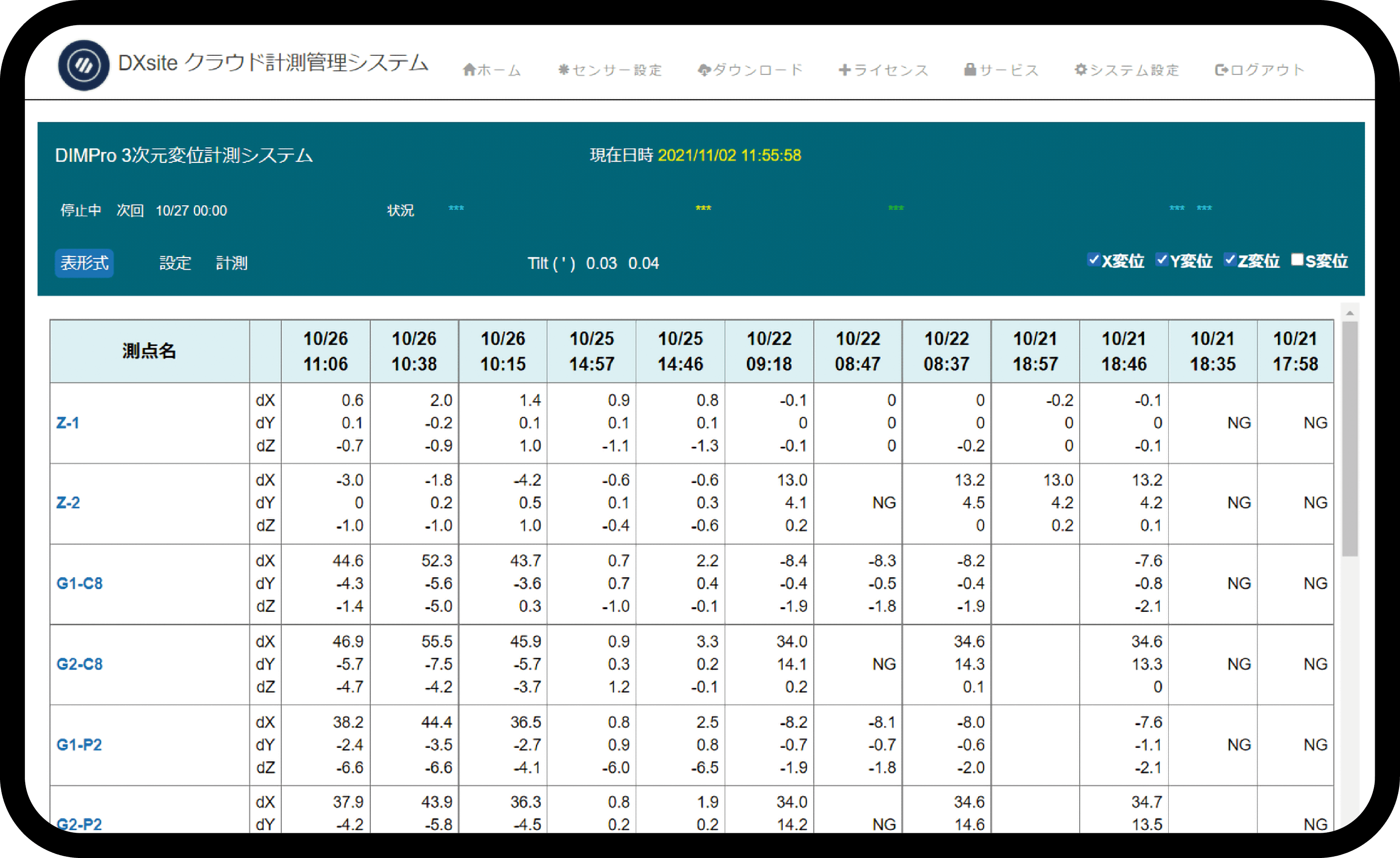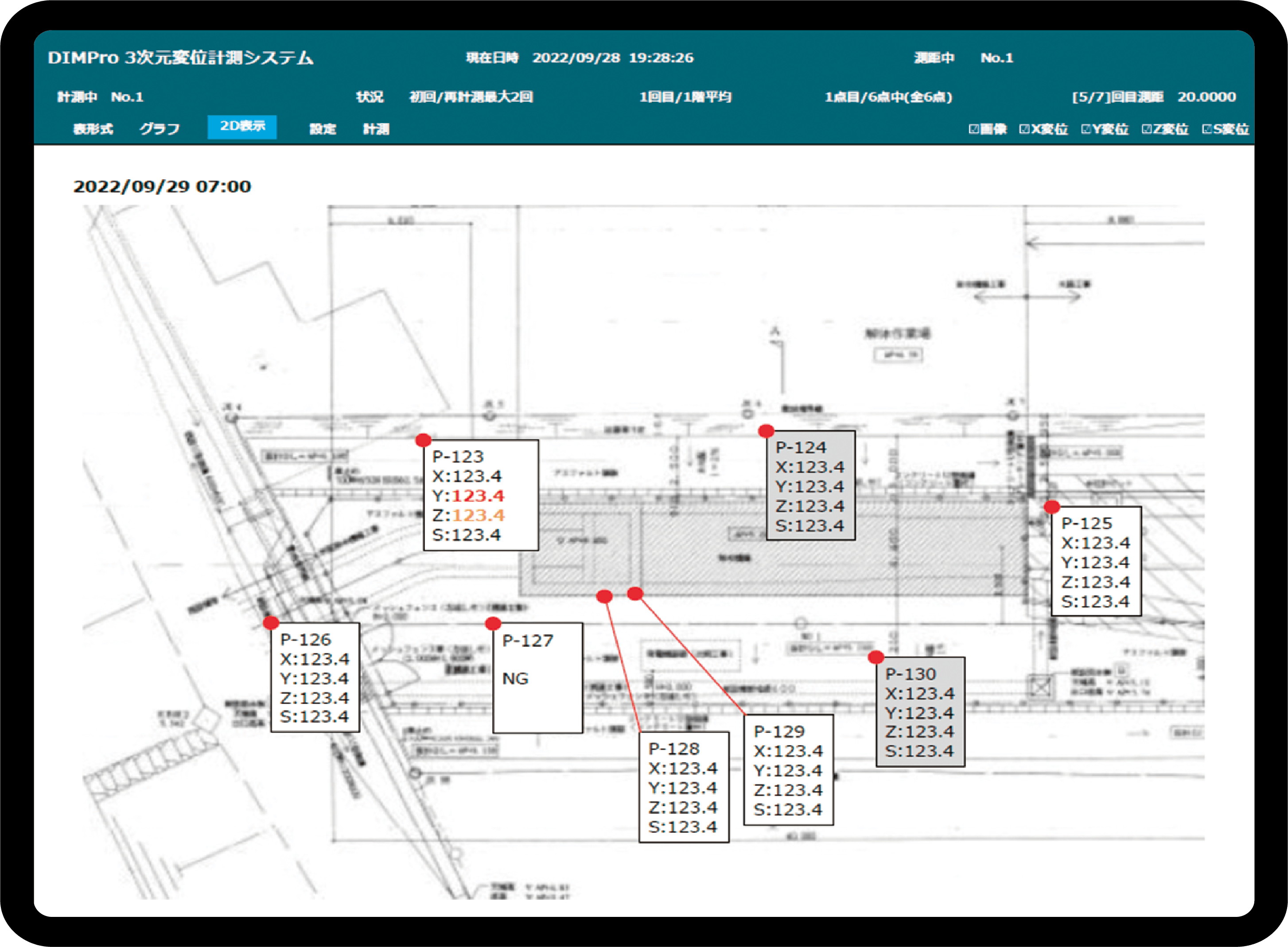 高精度な自動視準トータルステーションを使用し、現場の3次元変位をリアルタイムに計測します。