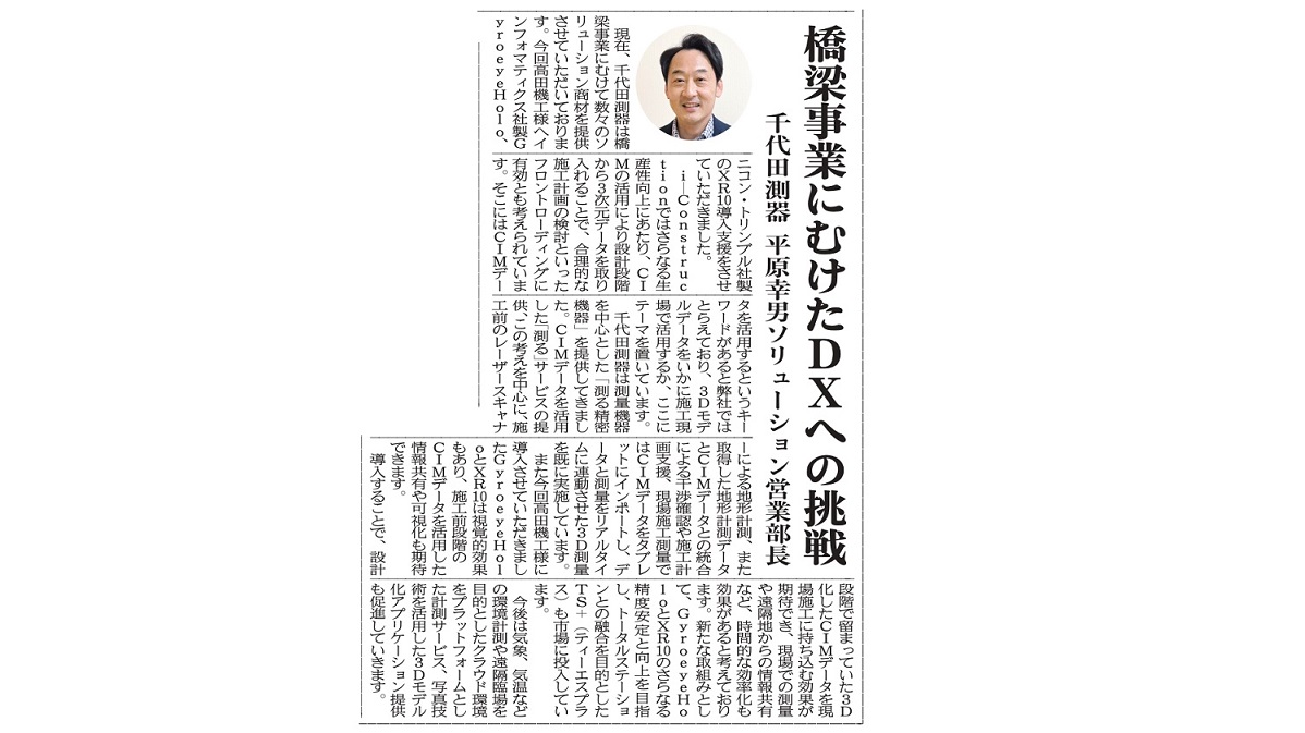 当社 執行役員 ソリューション営業部 営業統括部長 平原 のインタビュー記事が“橋梁事業にむけたDXへの挑戦” と題しまして掲載されております。橋梁新聞は、1973年(昭和48年)創刊されたわが国唯一の、橋の専門新聞になります。関連ソリューション:XR10・GyroEye Holo TS+