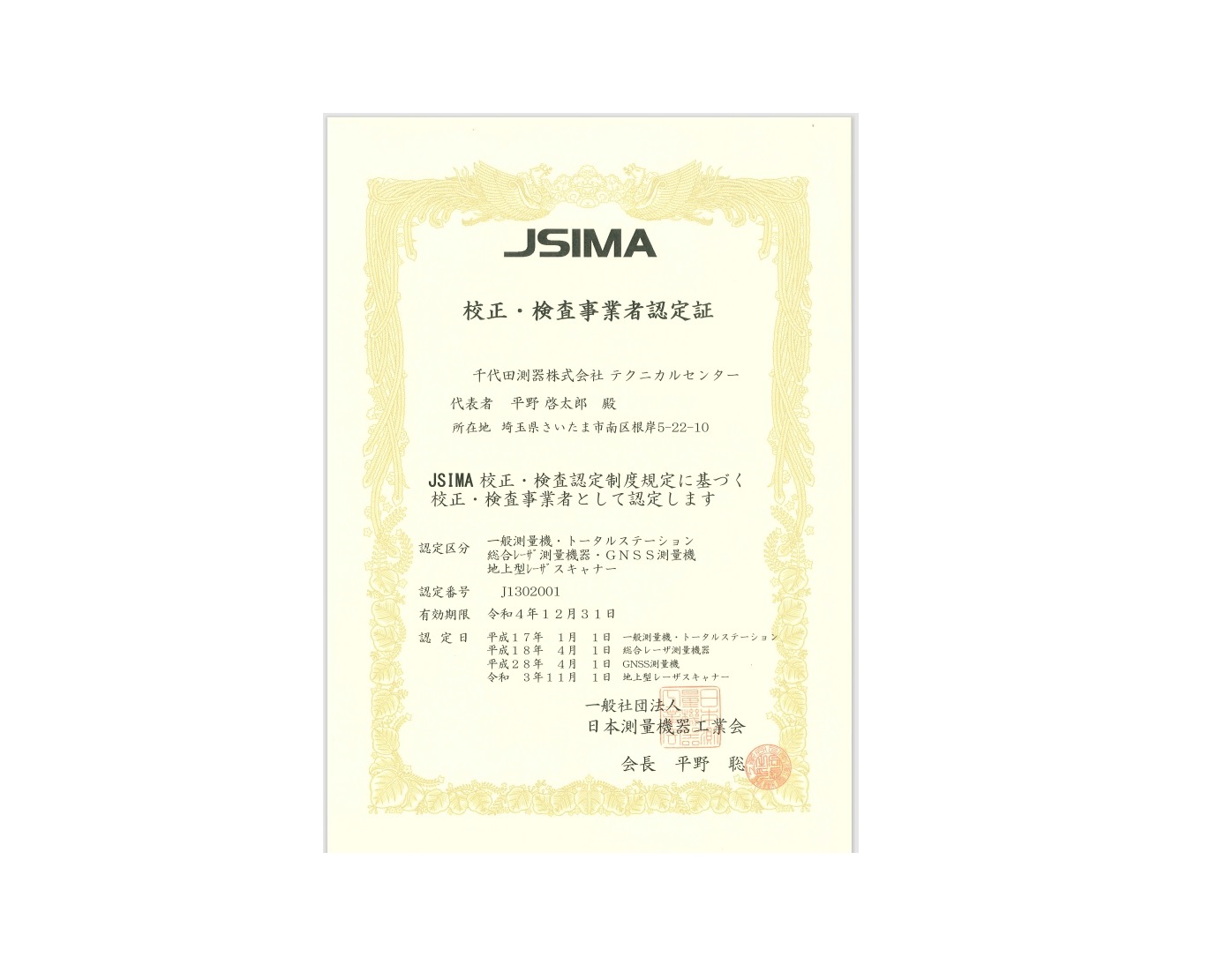 JSIMA115規格によるTLS検査が当社で可能になりました。当社センター内に検査場・設備を常設しております。TLS及び、一般測量機・トータルステーション・総合レーザ測量機器・GNSS測量機の校正は当社で可能です。詳細につきましては、当社営業担当までお問合せ下さい。認定番号 J1302001認定日 令和3年11月1日 地上型レーザスキャナー