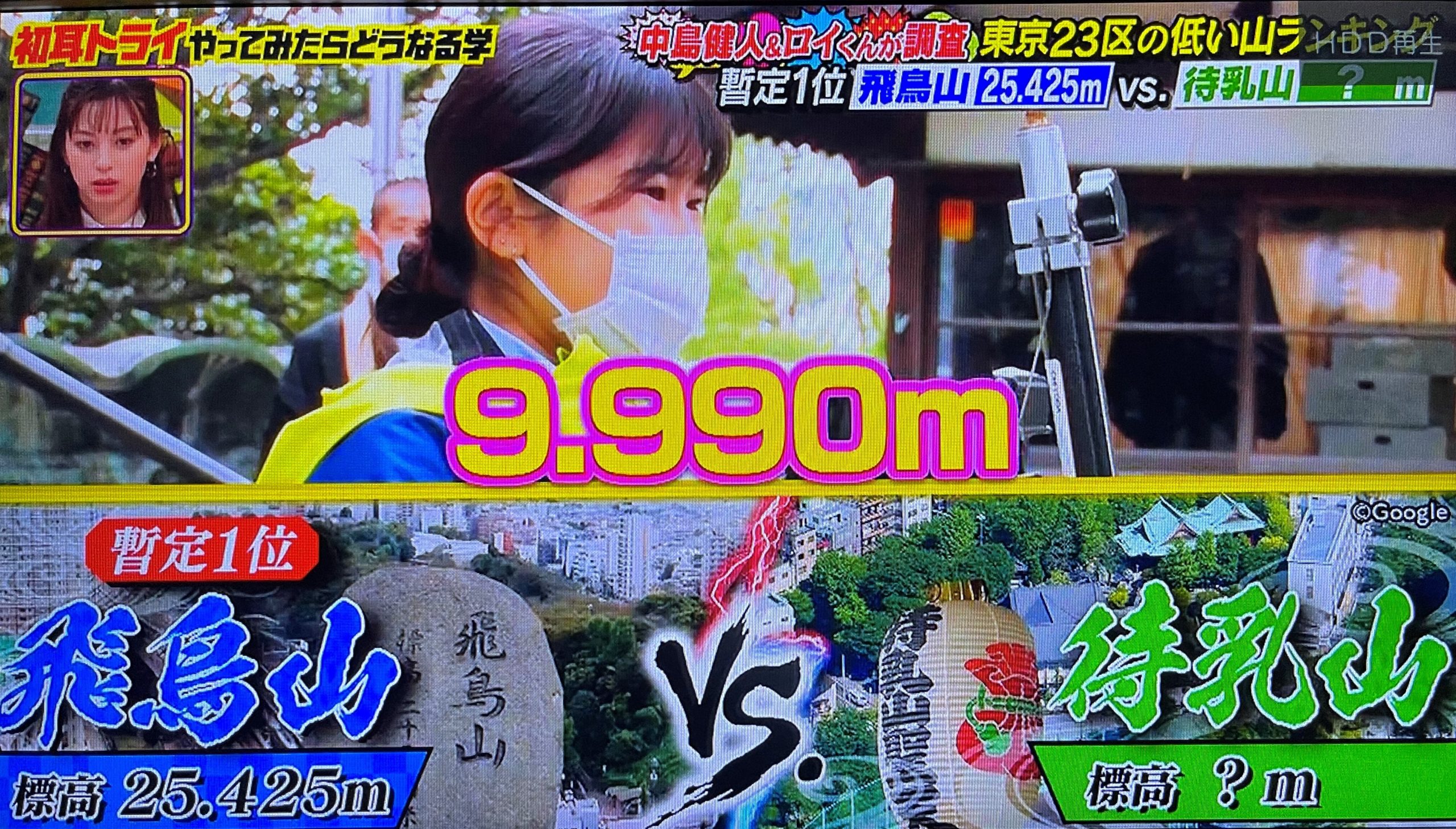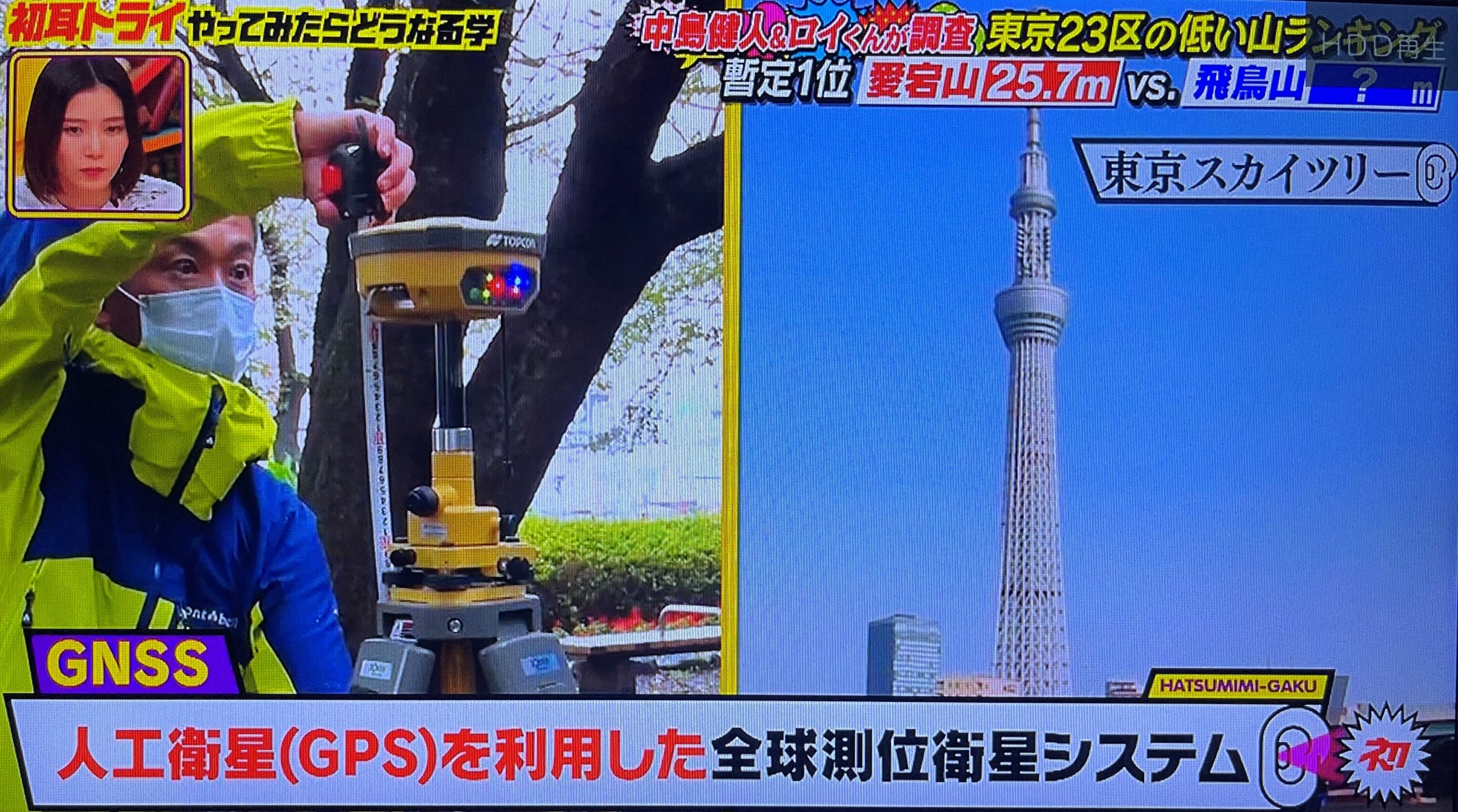 東京23区内の低い山ランキングという番組主旨に伴い、当社社員 小野淳・川島つくしが出演し、弊社所有機材使用にて、技術指導・計測協力を行いました。使用機材;HiperV(Topcon) /TREND-FIERD(福井コンピュータ)「林先生の初耳学」はMBS/TBS系で毎週日曜よる10時放送。