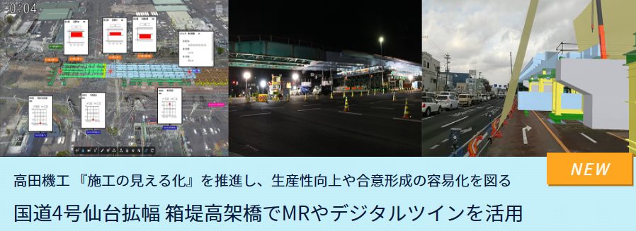 当社の取り組み内容といたしましては建設DX(デジタルトランスフォーメーション)の一環としてMR(複合現実)を用いた橋桁の色彩や架設のシュミレーション。クラウド計測管理システムDXsiteを用いた桁位置のリアルタイム管理。これらの取り組みを行いました。