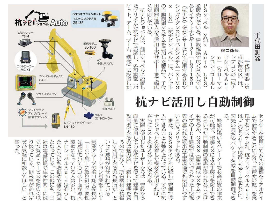 建設通信新聞の「i-Construction2・0現場特集2025」にて当社取扱い商材記事、インタビュー記事を掲載いただきました。掲載日:2025年(令和7年)1月31日 (金曜日)掲載ページ:(17)関連ソリューション杭ナビショベルAuto