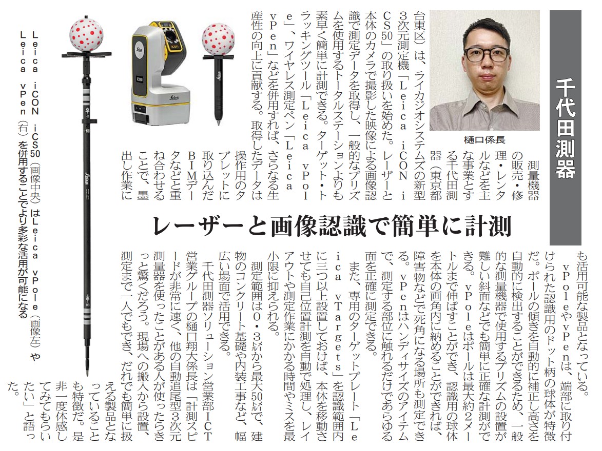 建設通信新聞の「BIM特集2025」にて当社取扱い商材記事・代表インタビューインタビュー記事を掲載いただきました。掲載日:2025年(令和7年)5月29日 (木曜日)掲載ページ:(22、29面)関連ソリューションLeica iCON iCS50