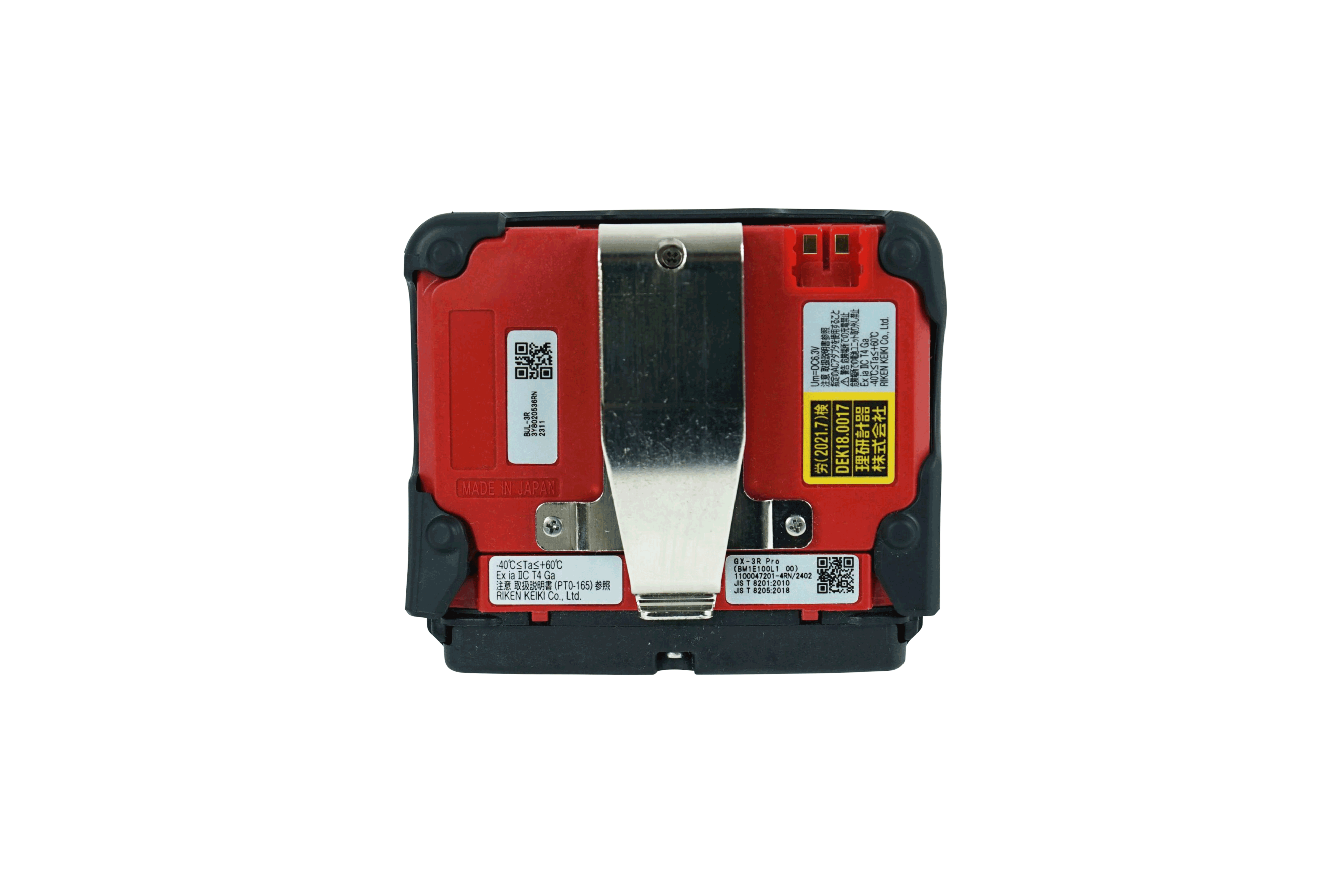 故障警報…ランプ点滅,ブザー断続,内容表示 パニック警報…予備警報,本警報(5秒間の予備警報後)の2段階 マンダウン警報…予備警報1(60秒),予備警報2(75秒)、本警報(90秒)の3段階 防爆の種類:本質安全防爆構造 防爆等級:Exia ⅡCT4 Ga 防塵防水(IP):IP66/68(2m,1h)相当 電源:単3形アルカリ乾電池×4本 使用温度:-40~+60℃(急変無きこと) 記録媒体:Bluetooth使用でブラウザ上で共有可能 寸法/重量:充電池使用時…約73(W)×65(H)×26(D)mm(突起部は除く)/約120g 乾電池使用時…約73(W)×65(H)×34(D)mm(突起部は除く)/約140g 動作時間:約25~40時間 |