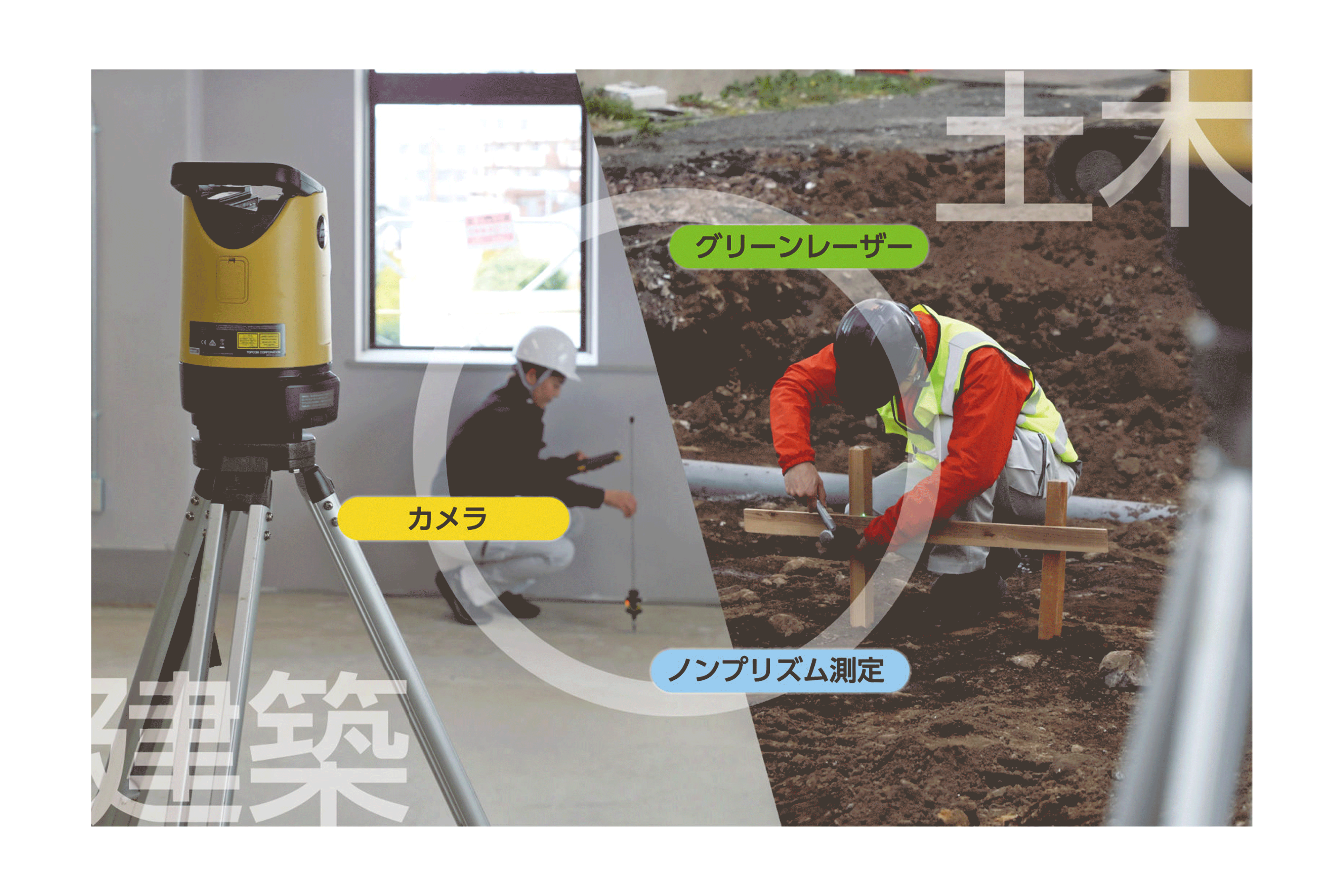 | 特徴 | 手元のスマートフォンでカメラ画像を確認しながら位置出し点へ移動できるため、従来のガイドライトによる誘導と比較して、作業を効率的に行えます。 ノンプリズム測定機能を搭載しました。構造物の際や屋内の隅部など、プリズムの設置がしにくい場所でも、正確な位置出しが可能です。 これにより、境界付近での丁張設置など、従来機では対応が難しかった施工をより簡単かつ効率的に行うことができます。 屋内外を問わず視認性に優れたグリーンレーザーポインターを搭載しました。薄暮時や屋内などの暗所でも視準ポイントを明確に確認でき、作業効率を向上します。 仰角+90°までの計測に対応し、従来機に比べ上方向の測定範囲を拡大しました。高所や天井付近での墨出し作業など、建築現場での利便性がさらに向上します。 |