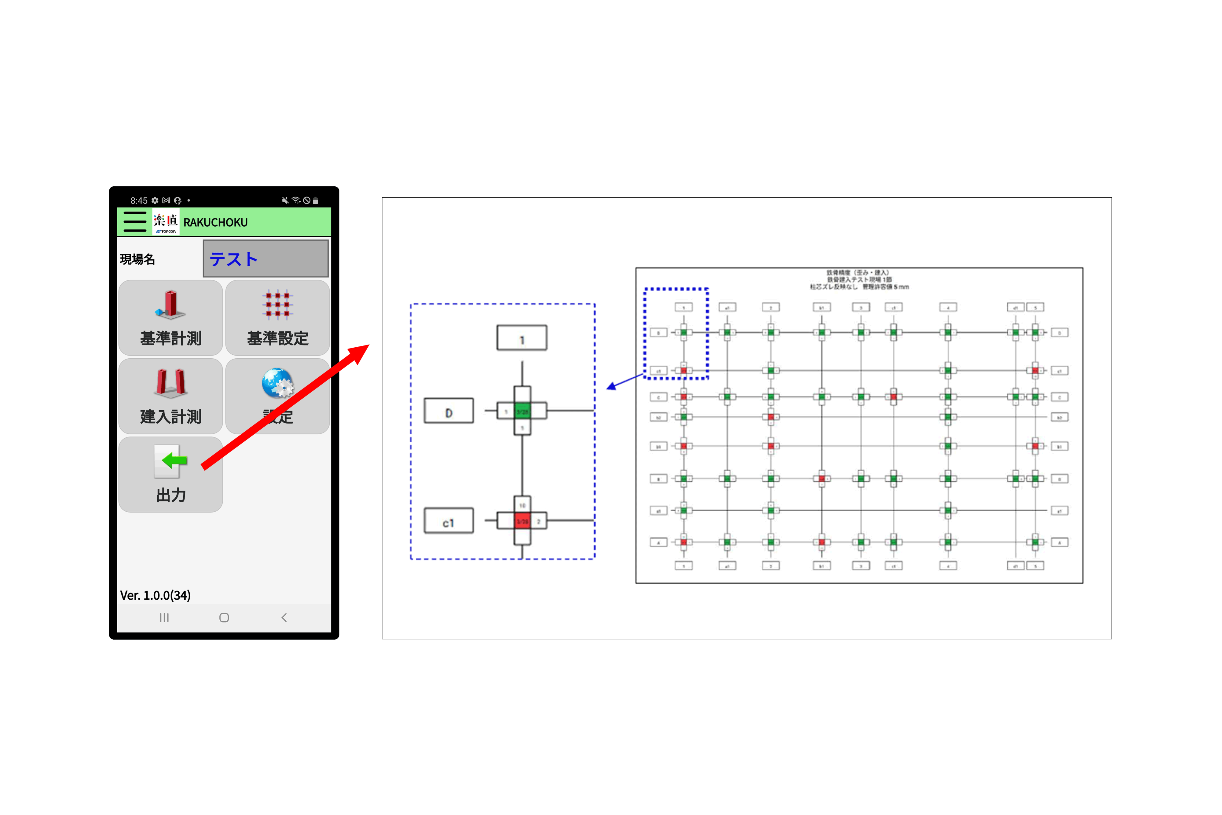 | 特徴 | スマホで建方! 「楽直」で鉄骨建入れ調整 「楽直」は鉄骨建方作業の際、スマホで計測器「楽位置」をコントロールし、柱の鉛直度を計測します。 1人で楽に建入調整をすることができ、作業終了後は出力ボタンにより記録・帳票データを自動作成します。 分かりやすい画面表示、誰でも使える簡単さ 設計データを用意する必要はなく、現場で入力を開始できます。 分かりやすい画面上で、通りの数、通り間の距離、プリズムを取り付ける位置などを設定できます。 最大柱4本分の両方向の倒れを1画面で表示 複数の鉄骨が計測できる場所に「楽位置」を設置、専用プリズムを複数の柱に取り付け、スマホアプリ「楽直」で計測します。 柱1本における前後左右の倒れを1回で計測、また1画面に最大4本分の柱の状態を表示でき、調整時間の大幅削減ができます。 帳票結果をボタン1つで自動作成しPDFで出力 デジタルで記録された計測結果データから、ボタン1つで帳票を自動作成でき、帳票はPDFファイルとして保存できます。 システム構成(別売り) 「楽直」は位置出し機「楽位置」と専用治具「ブーメランミラー」を組み合わせて使用します。 |