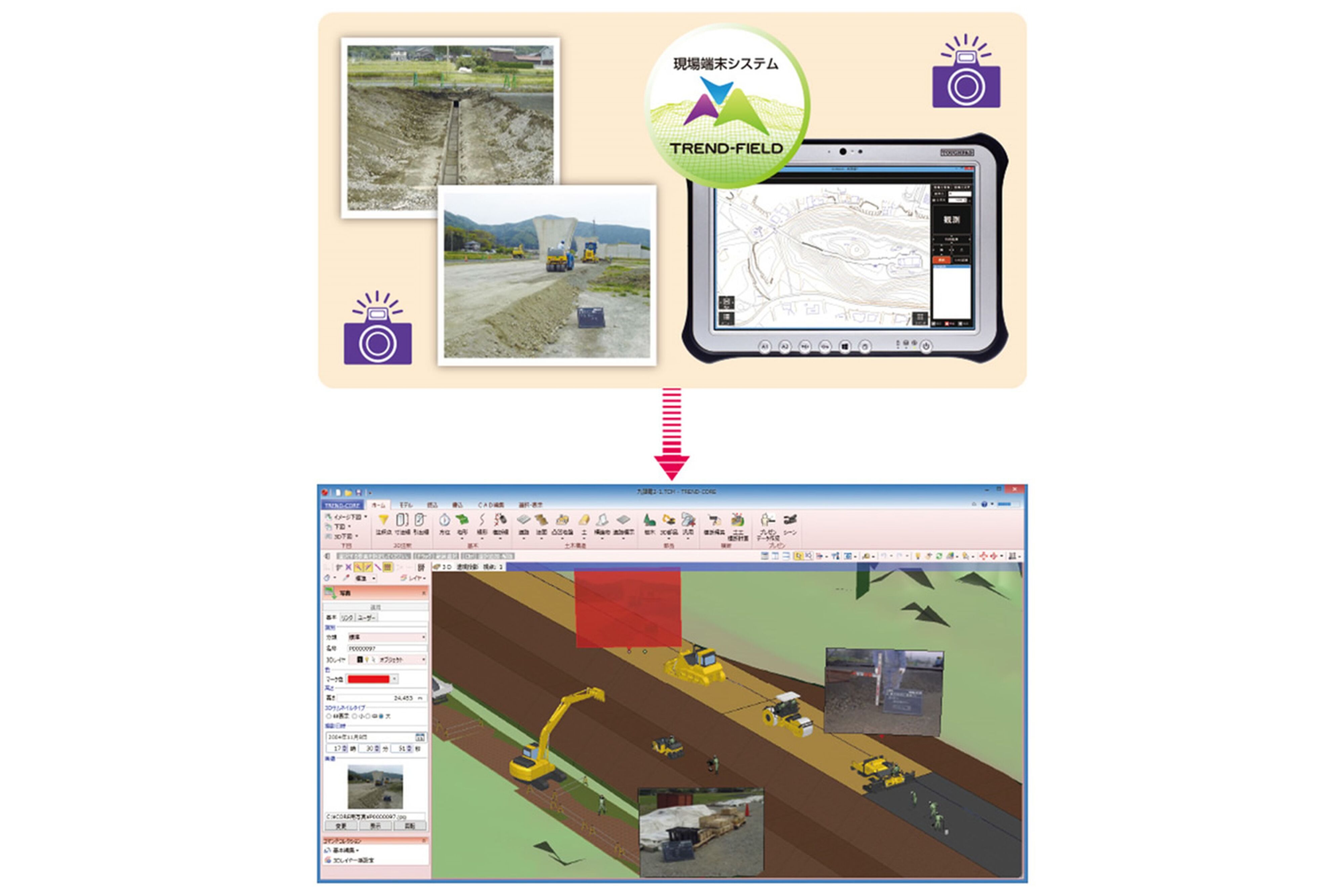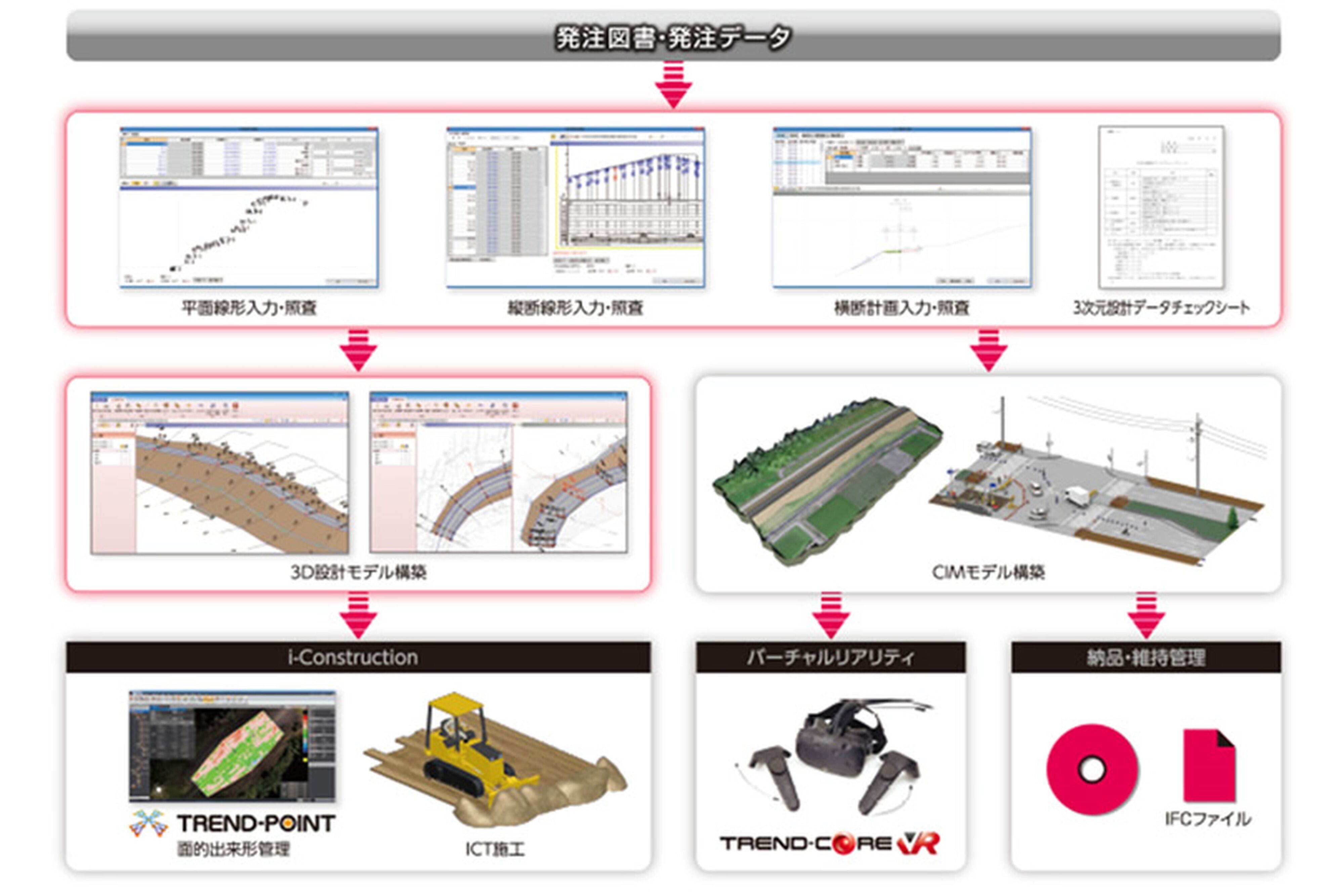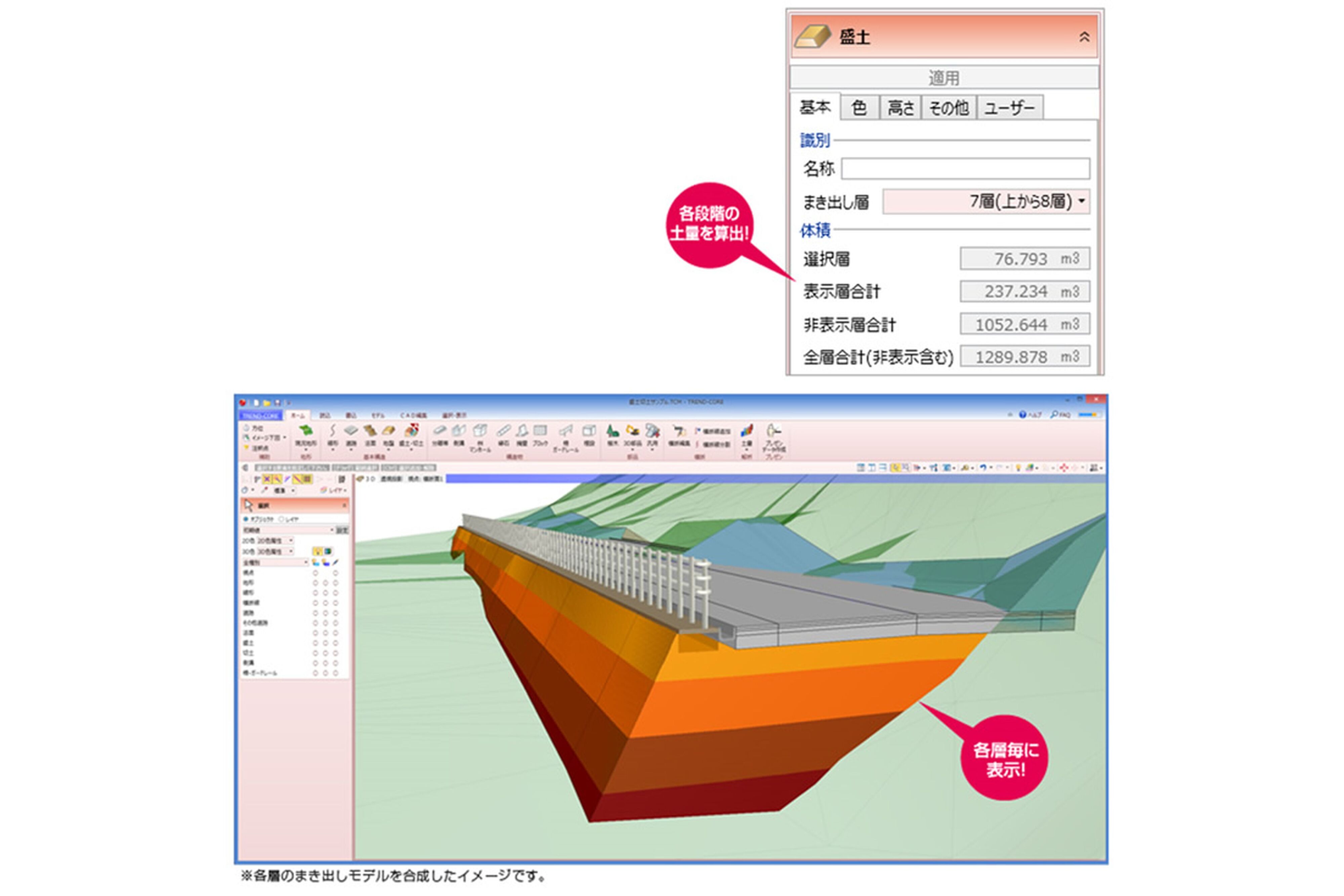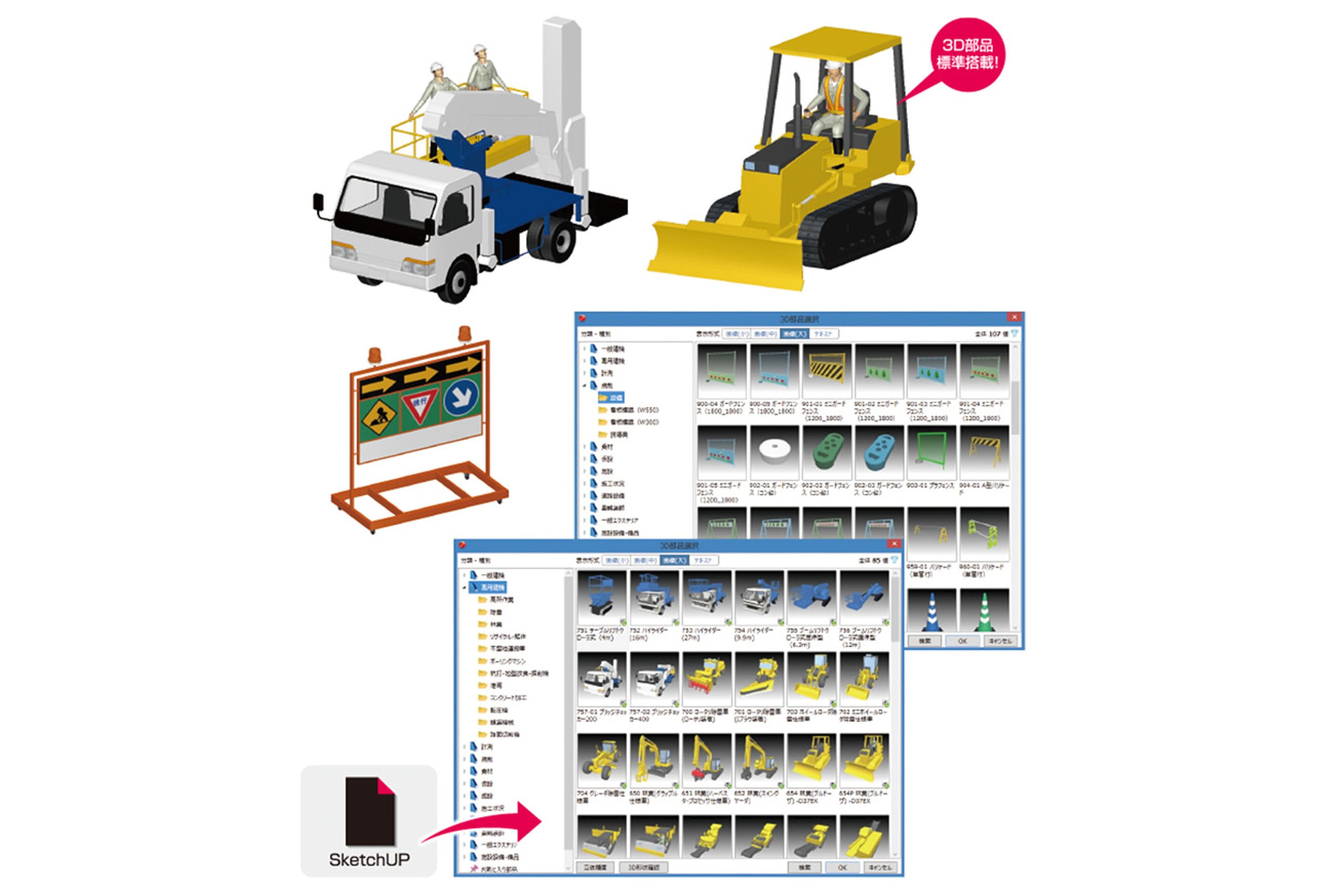 | 特徴 | 実績と計画の土量を比較できる土量シミュレーション機能現況と計画モデルから、 メッシュ法による土量計算が行えます。 結果は計算根拠と共にCSVファイルとして出力可能です。 また、【TREND-POINT】から出力されたメッシュ土量計算データを読み込むことも可能なため、 実績と計画の土量を比較検討することができます。法面・道路などの計画モデルと地形情報モデルから 盛土・切土オブジェクトの自動生成が可能です。 盛土オブジェクトでは、指定したまき出し厚による段階的な施工モデルを簡単に再現できます。 各段階や全体の土量算出にも対応しています。 ICT施工や計画土量算出、面的出来形管理などで利用する3次元設計データの作成が行えます。 発注図書(平面図及び縦横断図)をもとにデータ入力を行い、 数値入力情報を比較する 設計照査にも対応しています。 バックホウ・ダンプトラックの一般的な重機や足場等の仮設材から、 1フィニッシャー・杭打ち機・台船等の特殊な重機までも含めて、今すぐ使える 土木施工専用の3D部品(約2,000点)を標準搭載しています。 Trimble SketchUP™のデータをインポートして利用することも可能です。 |